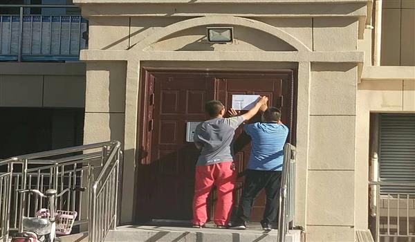 外線人員在居民單元門張貼充水通知